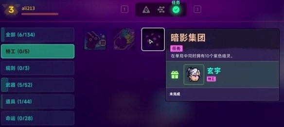 達(dá)成條件為在單局中同時(shí)擁有10個(gè)紫色暗靈,完成任務(wù)可解鎖特工玄宇。