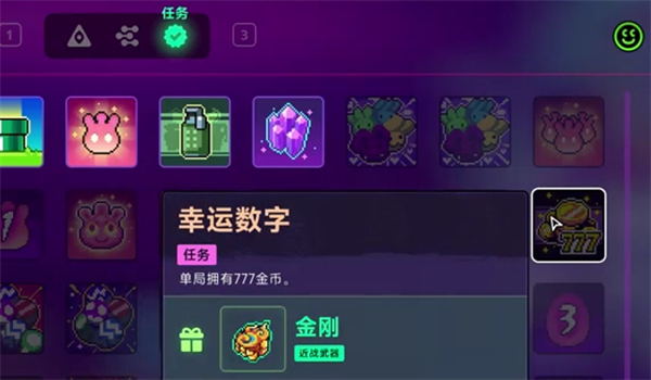 單局擁有777金幣,完成任務(wù)獲得近戰(zhàn)武器金剛。