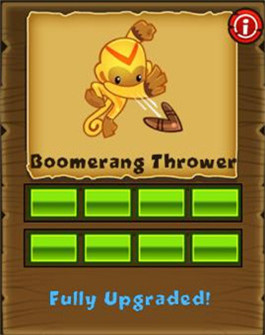 回旋鏢猴,在《射氣球》游戲里技能可見(jiàn)一斑。弧線式攻擊,射速一般,回旋鏢開(kāi)始的時(shí)侯連續(xù)攻擊3個(gè)氣球后消失。
