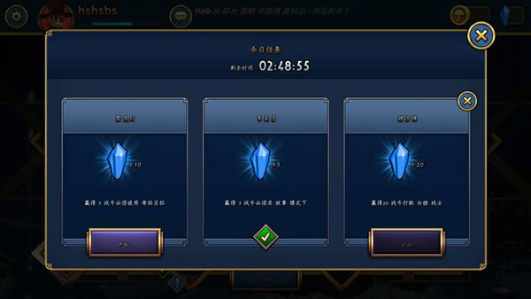 1、任務(wù):在游戲的大廳頁面點(diǎn)擊任務(wù)可以查看每日任務(wù),這里每天會(huì)為大家派出三個(gè)任務(wù),完成任務(wù)后可以領(lǐng)取到相應(yīng)的寶石獎(jiǎng)勵(lì)。