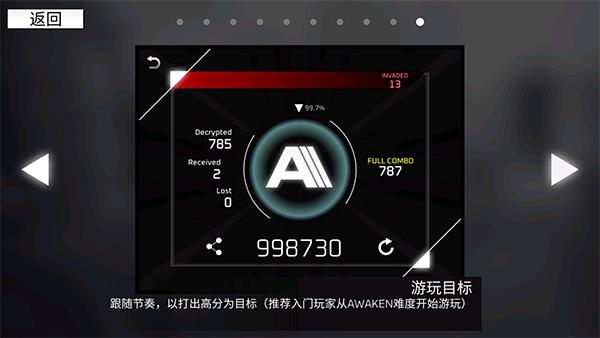 跟隨節(jié)奏,以打出高分為目標(推薦入門玩家從AWAKEN難度開始游玩)。