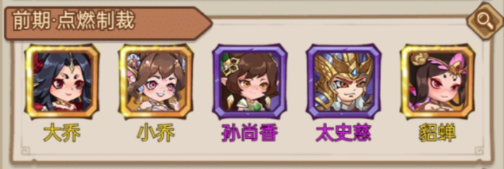 以吳國(guó)陣容為班底,延續(xù)第二回合傷害;輸出以大喬為核心,其他武將可均衡培養(yǎng),貂蟬回復(fù)前排提高前排攻擊,為第二回合打下鋪墊。
