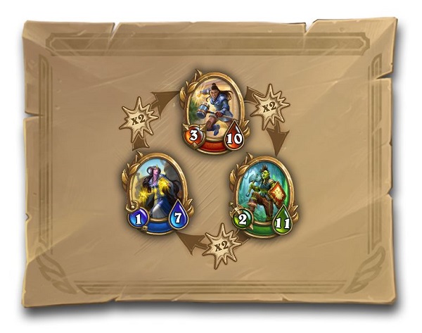 在這個模式里,不同職業(yè)間是存在雙倍傷害的克制關(guān)系的,紅色護衛(wèi)克制綠色斗士,綠色斗士克制藍色施法者,藍色施法者克制紅色護衛(wèi),這種克制存在于所有的技能當中,即不管綠色施法者是用物理技能還是法術(shù)技能,都可以對紅色護衛(wèi)造成雙倍傷害。