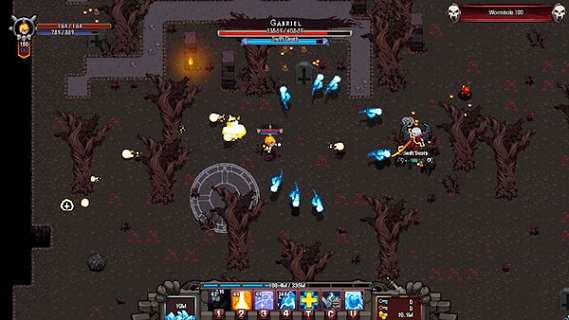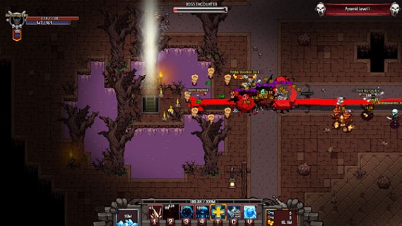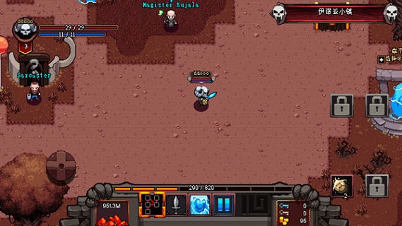 在城鎮(zhèn)中有一個藍色的橢圓,通過這個橢圓的魔法門我們可以選擇想要進入的戰(zhàn)斗區(qū)域。接著就可以開始激動人心的戰(zhàn)斗了。來到一個場景之后,每一個回合都有一定數(shù)量的怪物出現(xiàn)。我們需要控制角色不斷的在場景中擊敗怪物和破壞場景中的箱子來獲得獎勵,有時候我們會撿到裝備,有時候我們會撿到金幣。通過這樣不斷的戰(zhàn)斗獲得獎勵讓自己的等級技能提升,獲得更好的裝備等等。