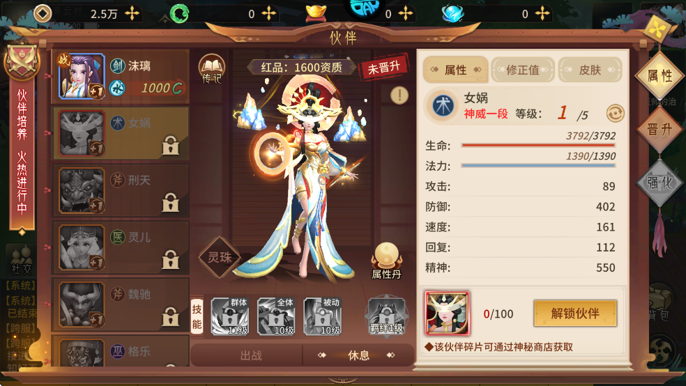 被動(dòng)技能:女媧擊殺任意目標(biāo)后,會(huì)引發(fā)山崩,對(duì)敵方單個(gè)目標(biāo)造成精神屬性307%的法術(shù)傷害