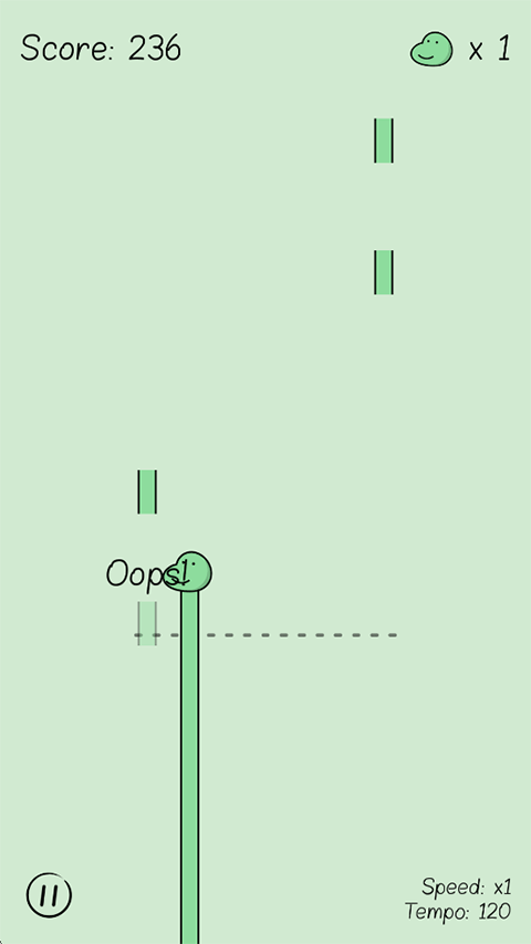 5、當(dāng)有3個(gè)長(zhǎng)條溜走后則游戲結(jié)束,每次游戲?qū)?huì)記錄你的分?jǐn)?shù);