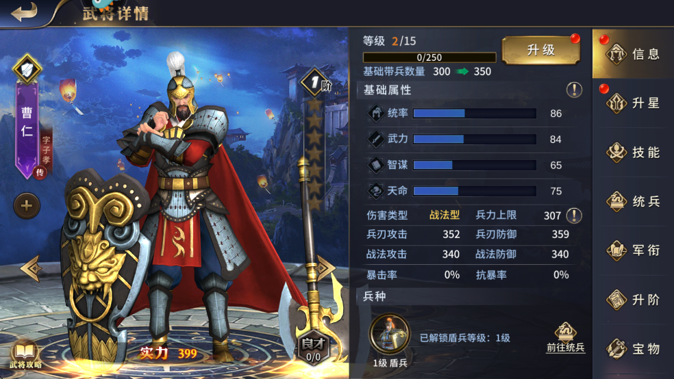 1、曹仁,戰(zhàn)法輸出型盾兵武將,主屬性統(tǒng)率,技能上偏向針對高額兵刃輸出的陣容。