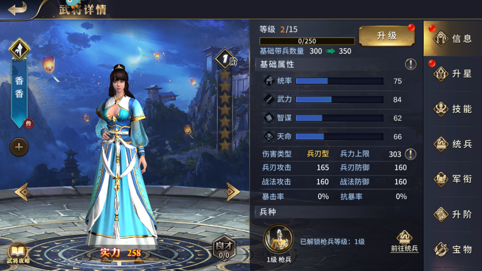 1、香香,兵刃輸出型槍兵武將,主屬性武力,作為沒落世家之女,而今長成為一名能上陣的武將,不可謂不驚嘆!