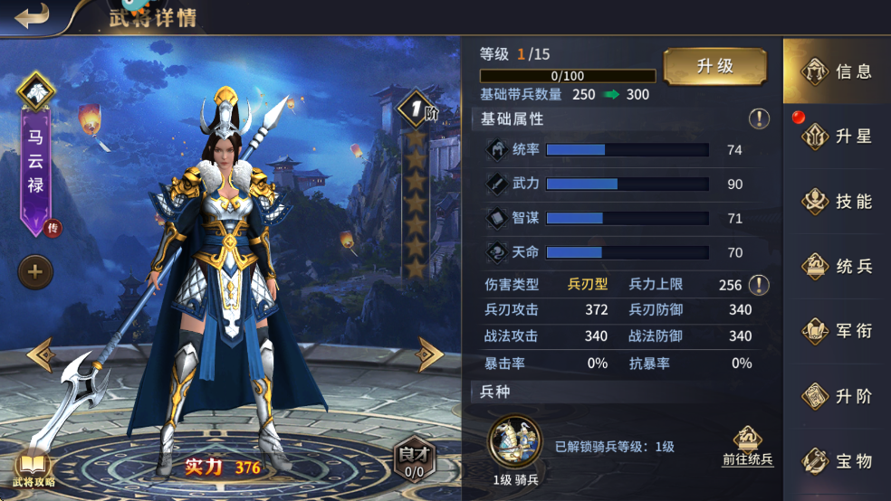 1、馬云祿,兵刃輸出型騎兵武將,主屬性武力,技能設(shè)計上專門克制盾兵,意在充分發(fā)揮騎兵的兵種特性,擊殺敵方盾兵,以取得兵力優(yōu)勢。