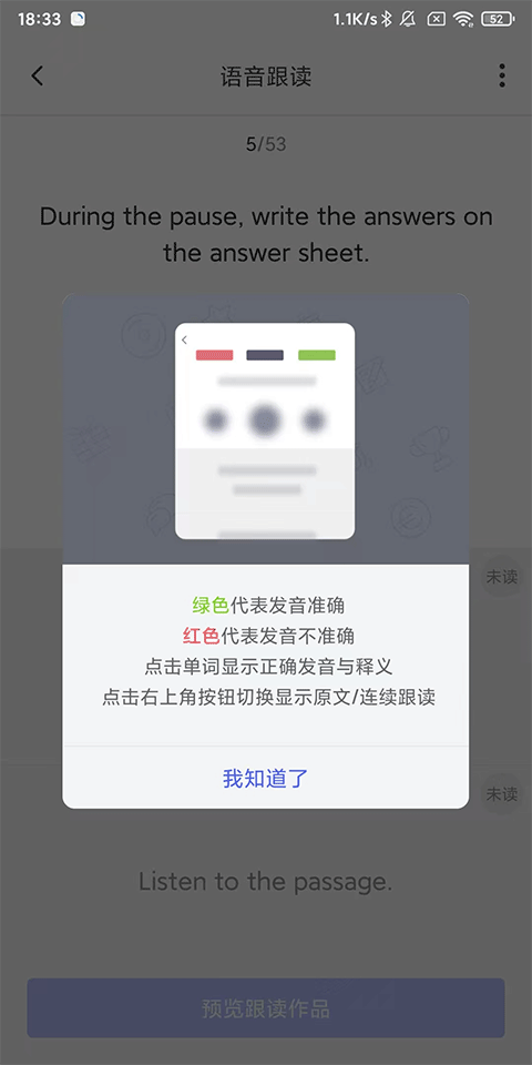 4、綠色代表發(fā)音準(zhǔn)確、紅色代表發(fā)音不準(zhǔn)確,點(diǎn)擊【我知道了】;