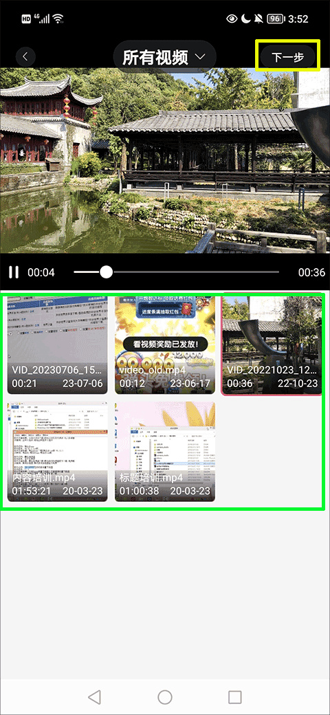 2、若選擇“視頻去水印”,請從 相冊 中導(dǎo)入需要處理的視頻,隨后點擊右上角的“下一步”進入編輯界面;
